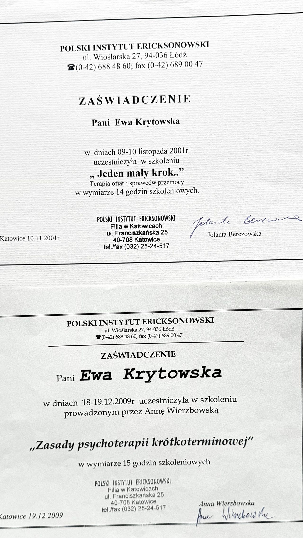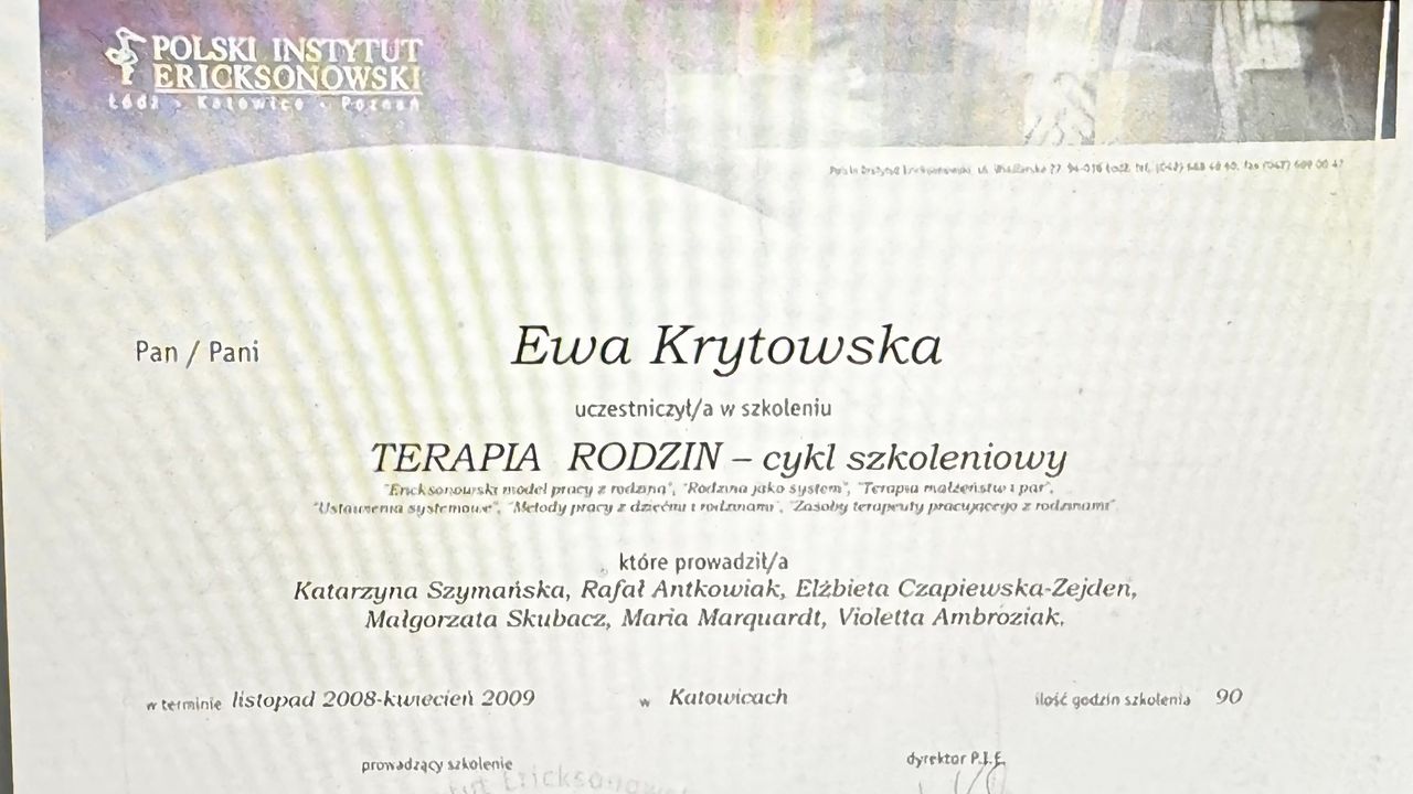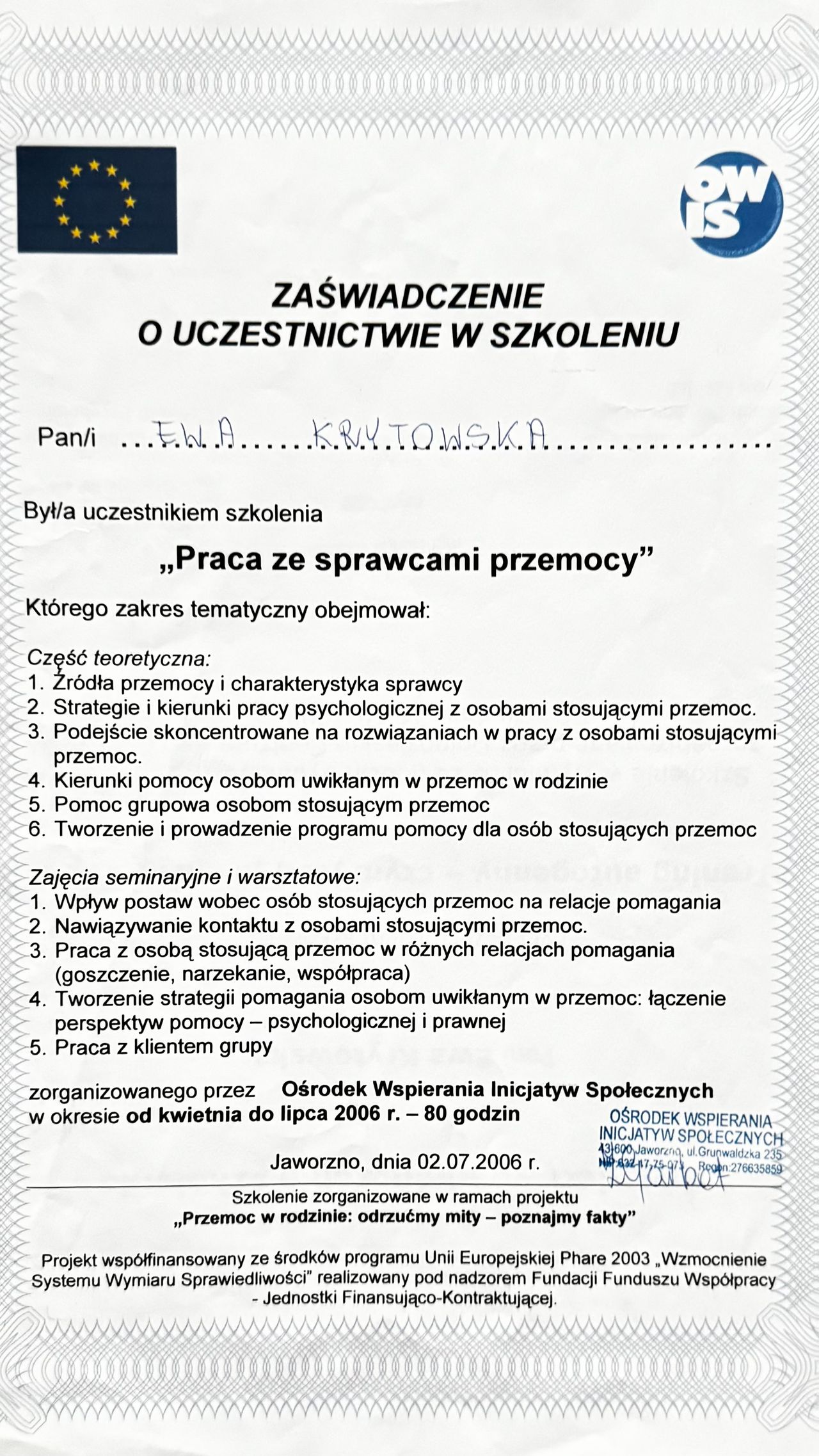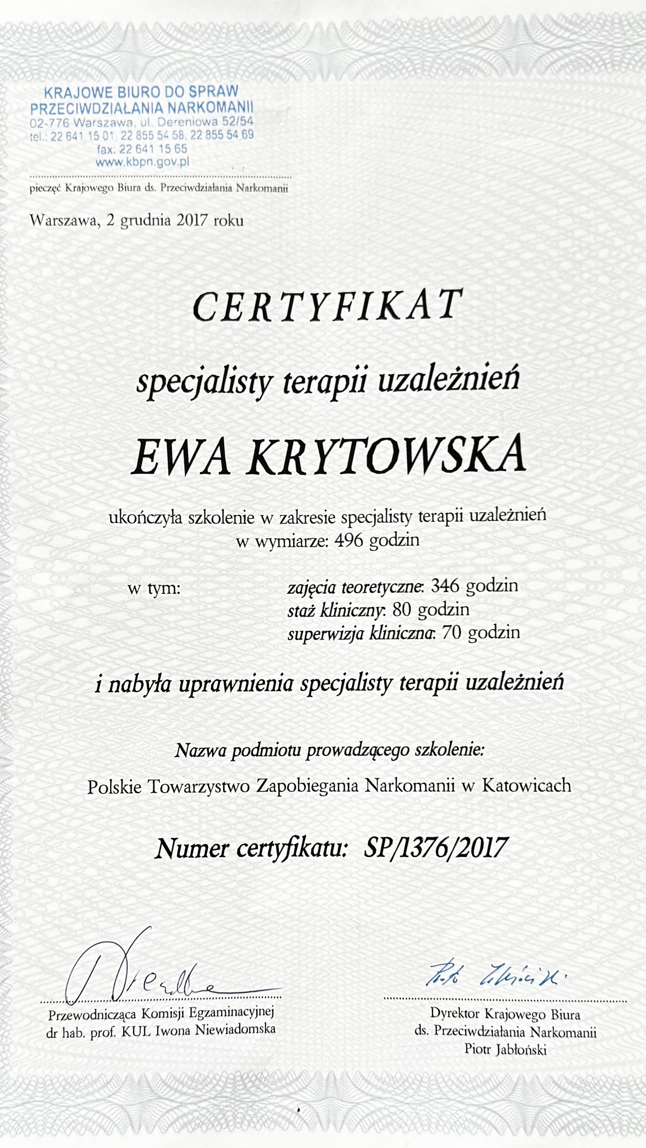 Jestem certyfikowanym psychoterapeutą uzależnień oraz mediatorem sądowym (ds. karnych, cywilnych i nieletnich). Pełnię również funkcję biegłego sądowego – znajduję się na liście Ministerstwa Sprawiedliwości osób uprawnionych do zbierania informacji na temat używania przez oskarżonego środków odurzających, substancji psychoaktywnych lub środków zastępczych. Posiadam także państwowy certyfikat w zakresie pracy z osobami doświadczającymi przemocy.