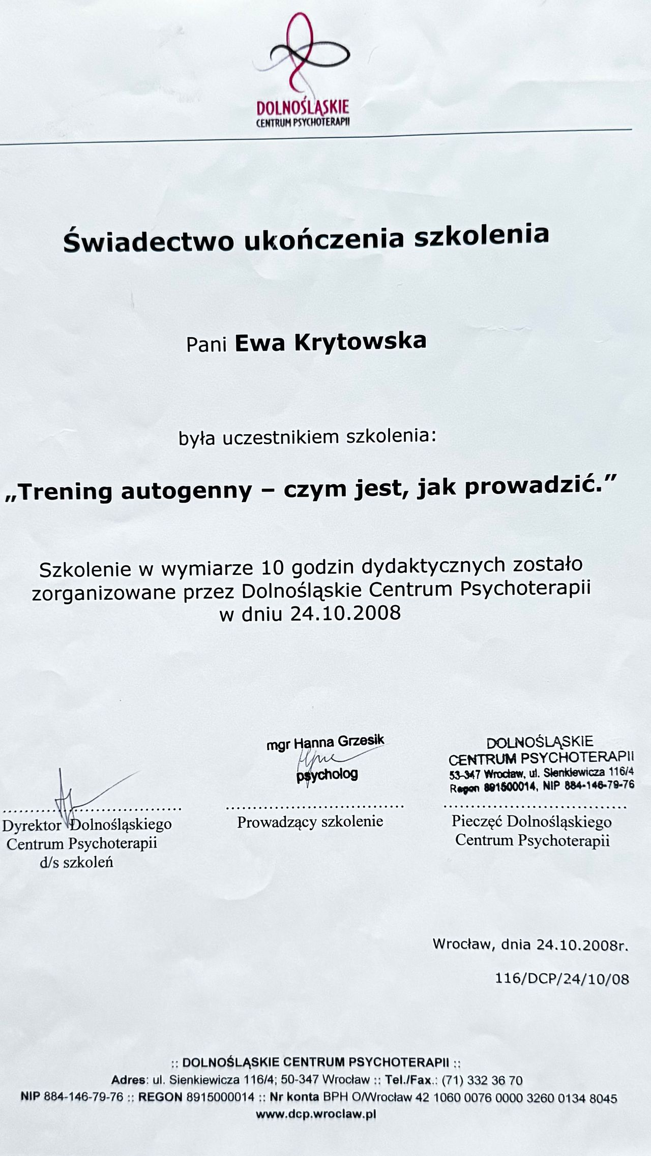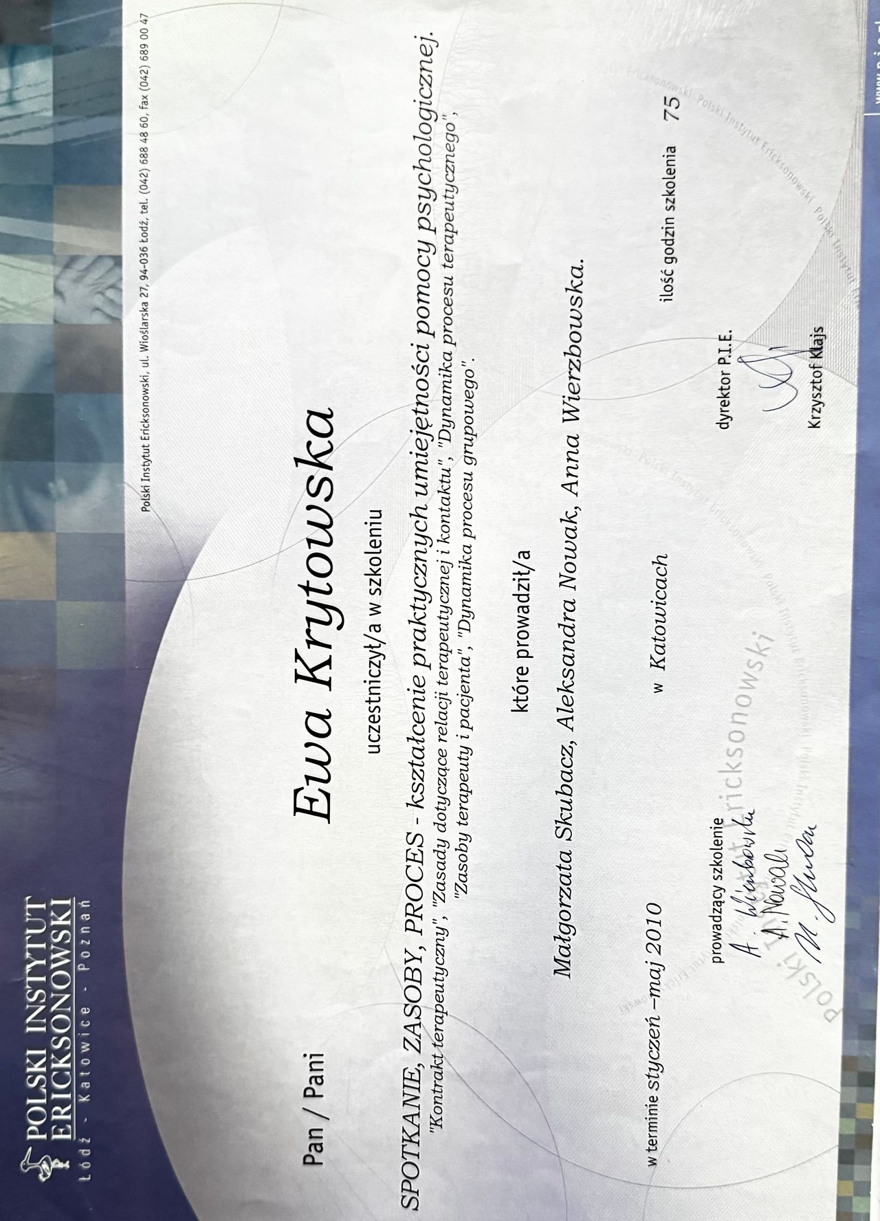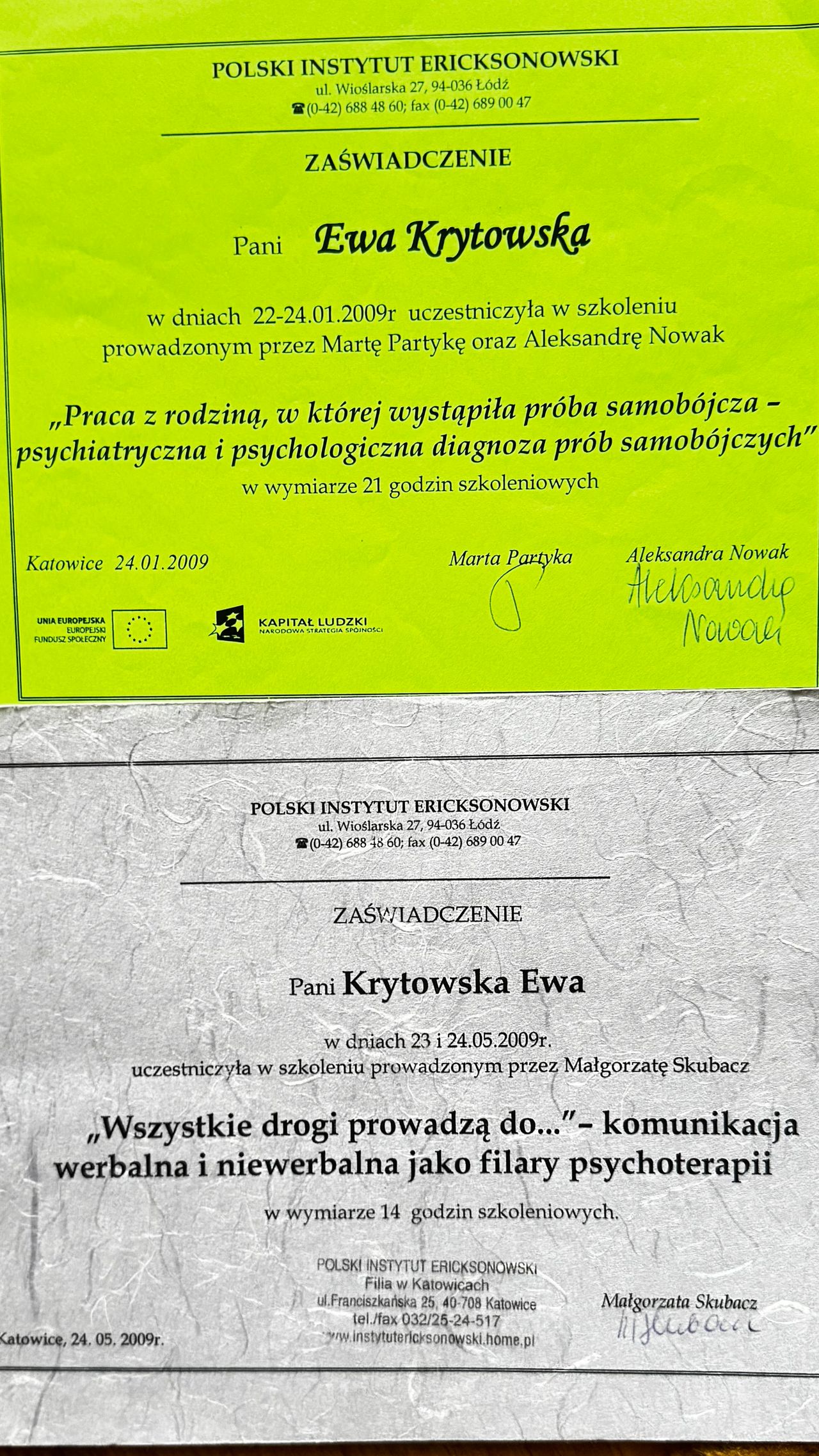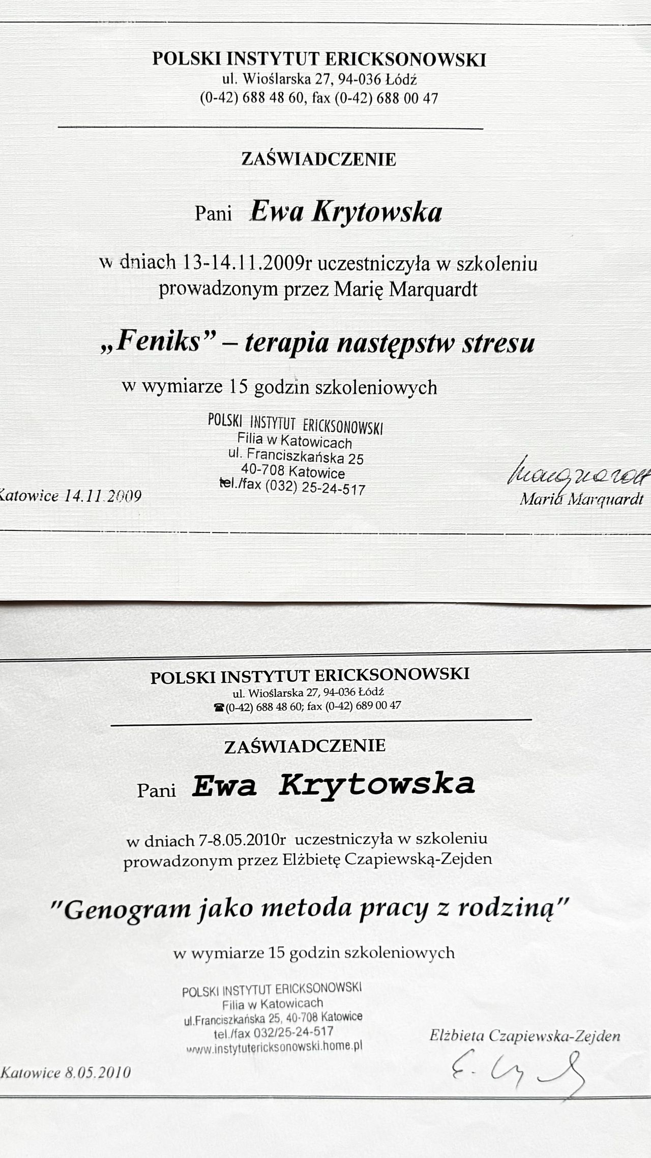 Jestem certyfikowanym psychoterapeutą uzależnień oraz mediatorem sądowym (ds. karnych, cywilnych i nieletnich). Pełnię również funkcję biegłego sądowego – znajduję się na liście Ministerstwa Sprawiedliwości osób uprawnionych do zbierania informacji na temat używania przez oskarżonego środków odurzających, substancji psychoaktywnych lub środków zastępczych. Posiadam także państwowy certyfikat w zakresie pracy z osobami doświadczającymi przemocy.